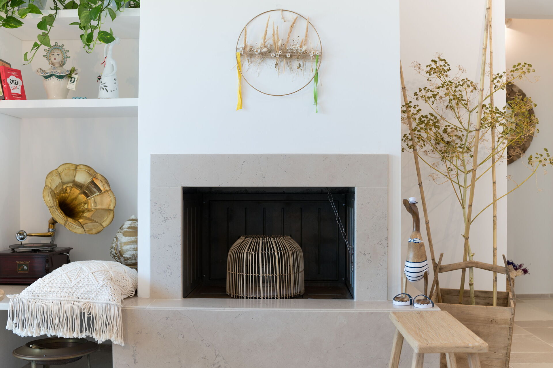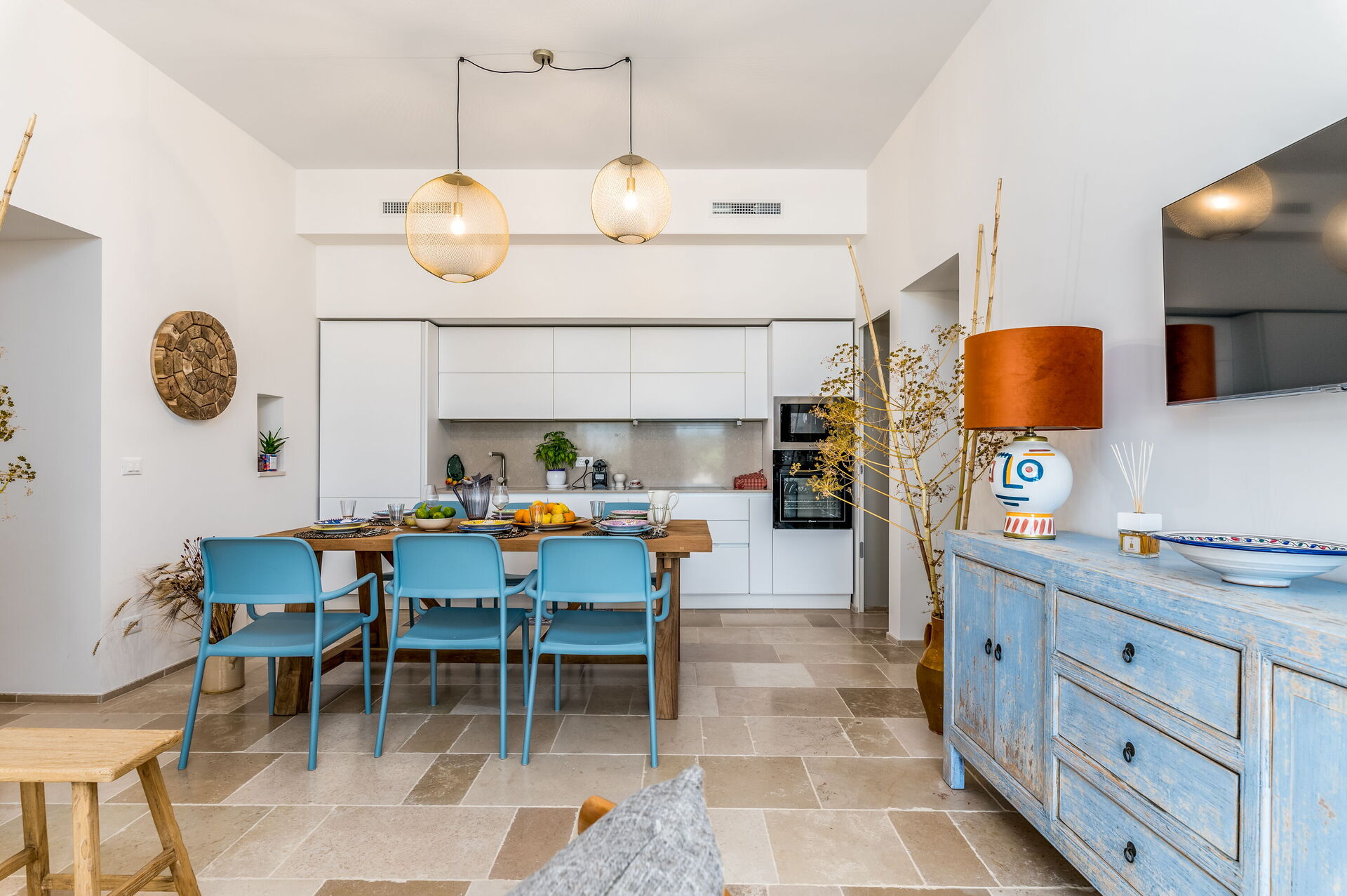 Keuken – woonkamer (40 m2): goed uitgeruste keuken, bank, open haard, airconditioning.