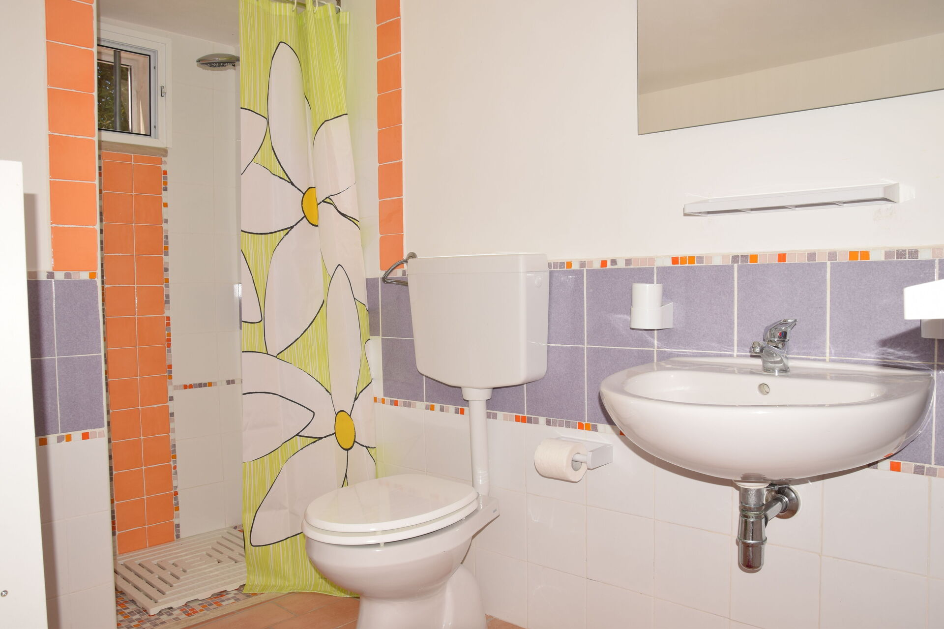 Badkamer: wastafel, toilet , bidet, douche, haardroger.