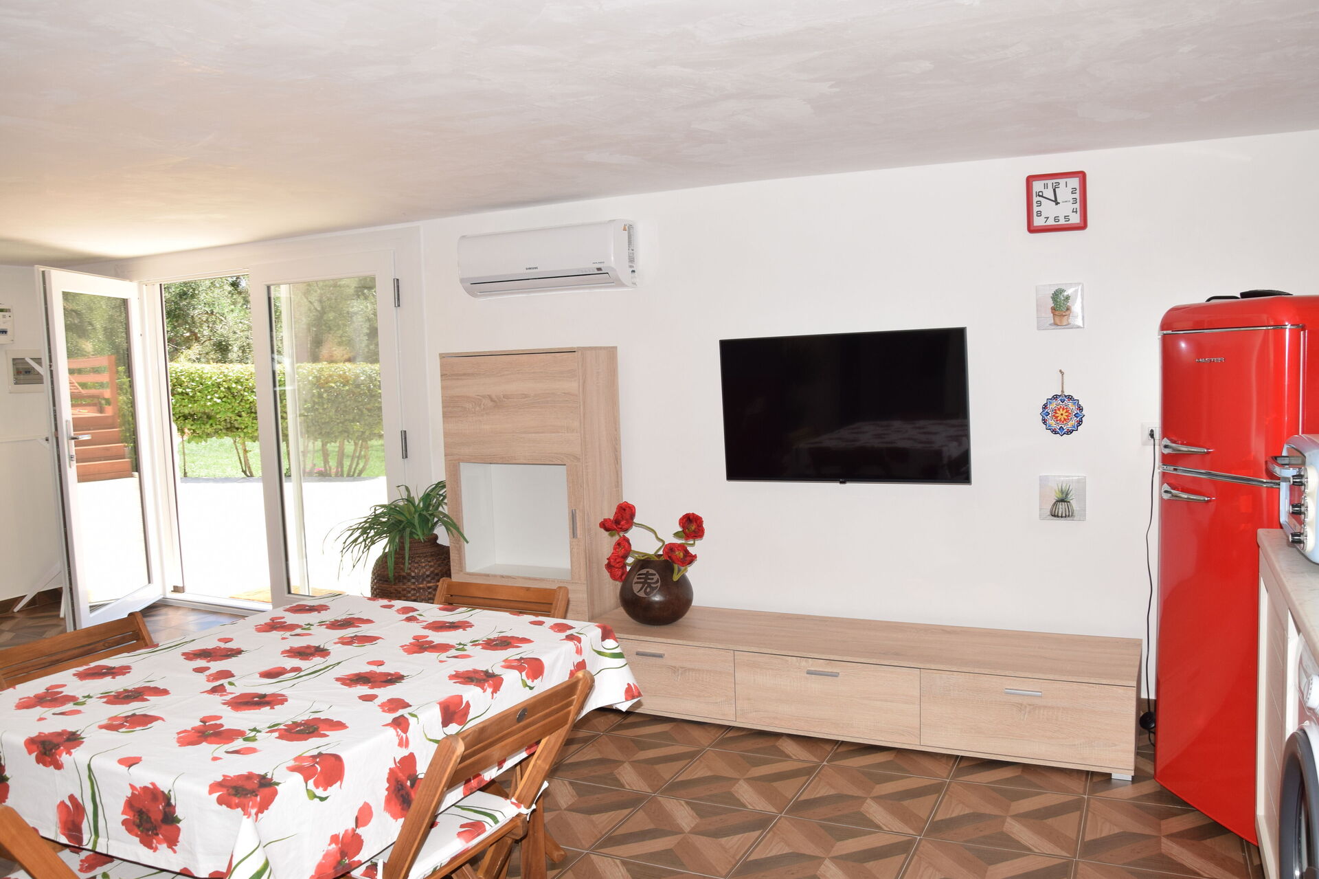 Open ruimte: eettafel, tweepersoons-slaapbank, WIFI internet, tv, ijskast, kookplaat, wasmachine, vaatwasser, goed uitgeruste keuken, magnetron, oven, broodrooster, italiaans koffiezetapparaat, co2 detector, uitgang naar de tuin, uitgang naar de patio, uitgang naar de veranda.