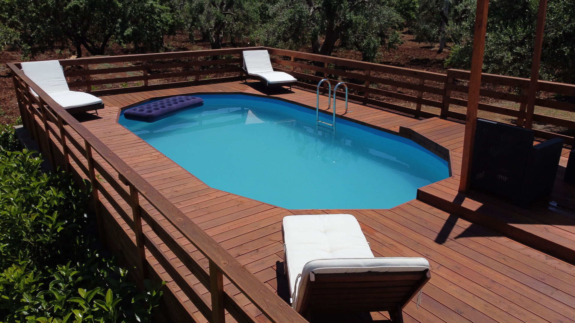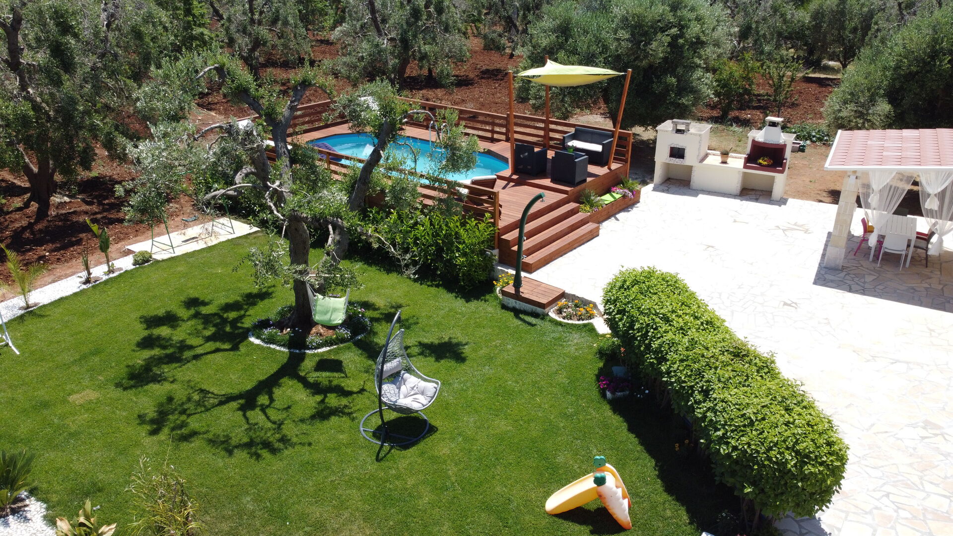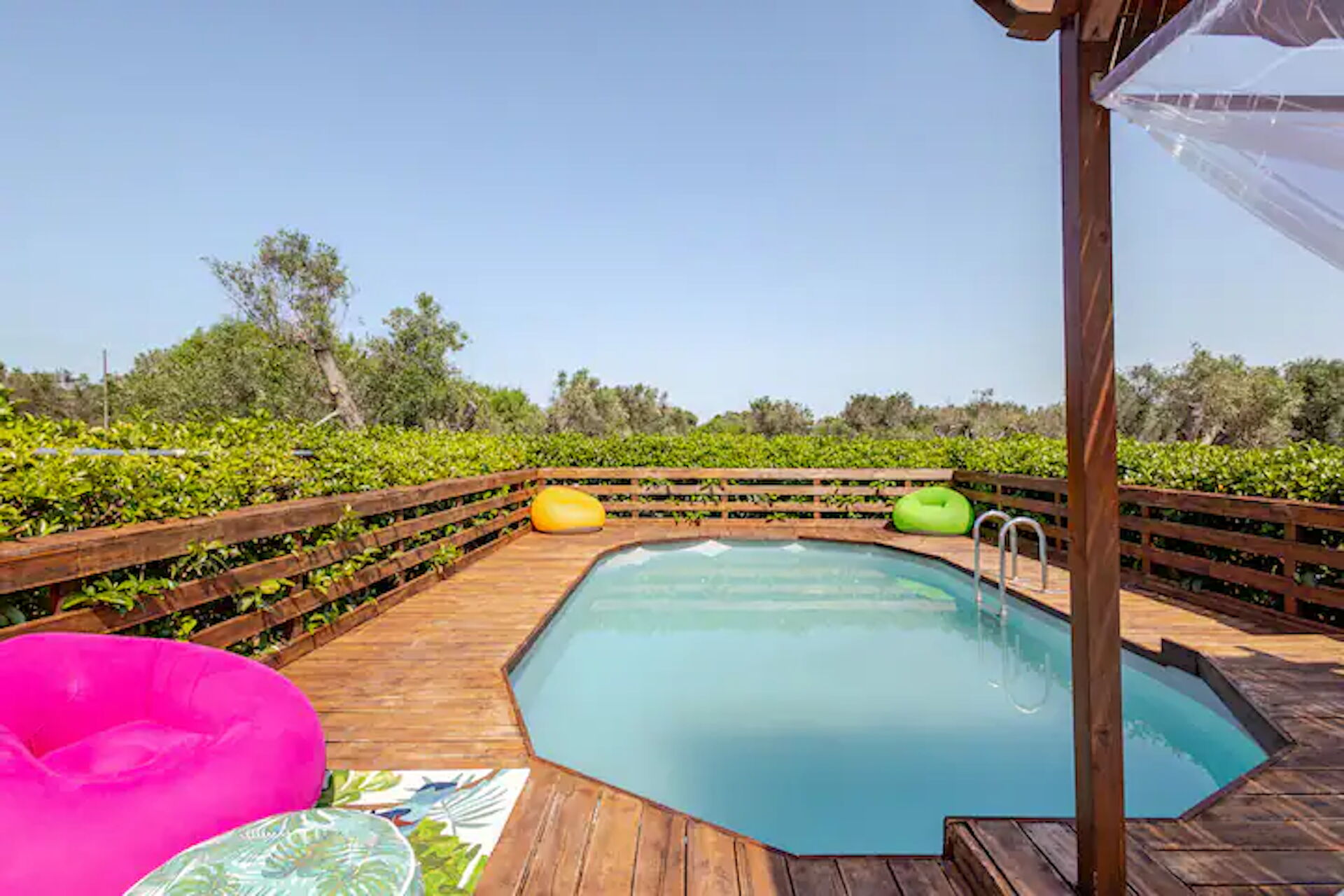 Tuin: zwembad, dineren in de buitenlucht, eettafel, tuinmeubilair, ligstoel, omheind grondstuk.