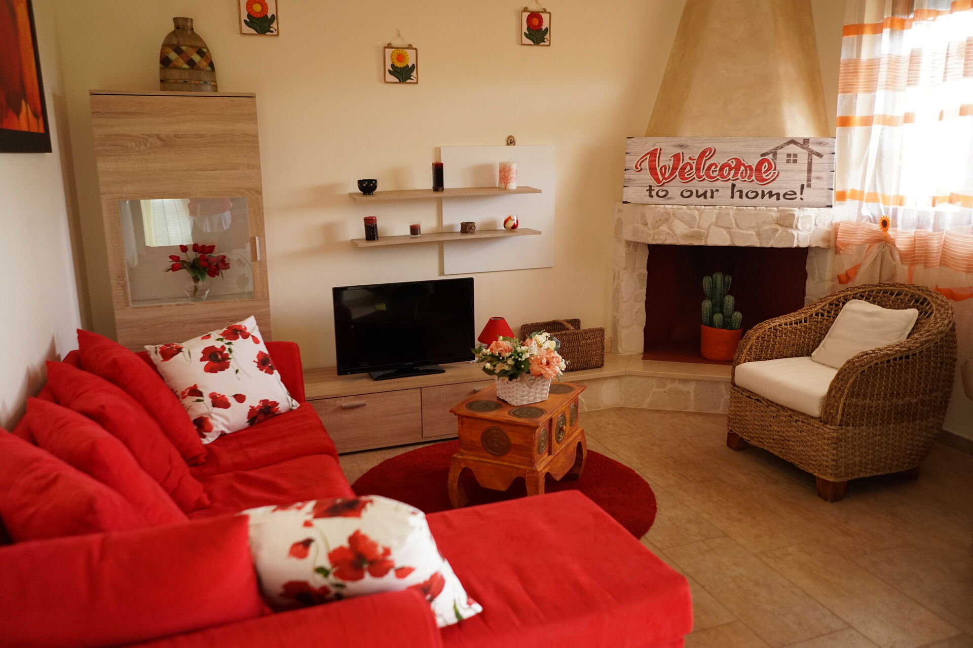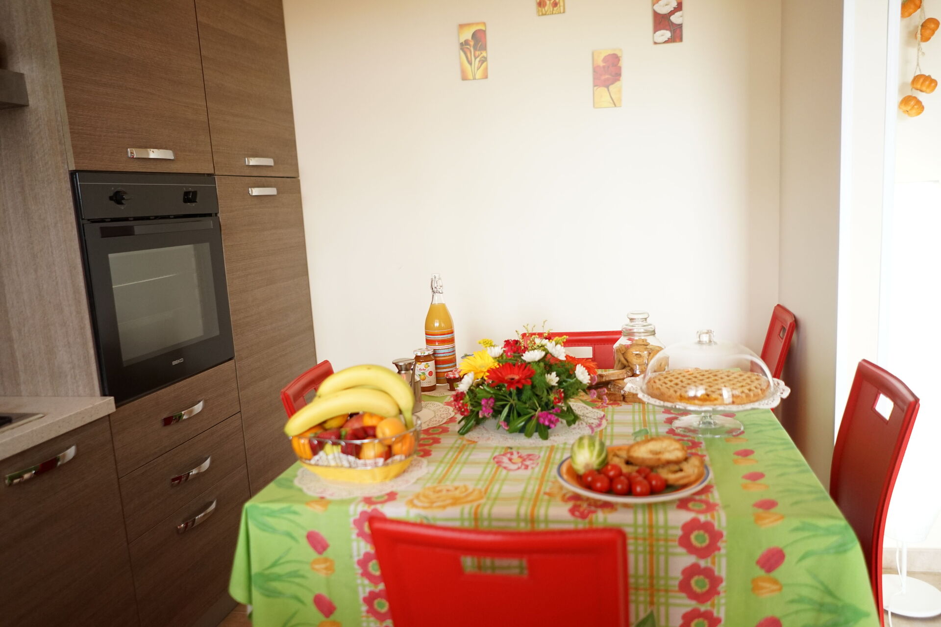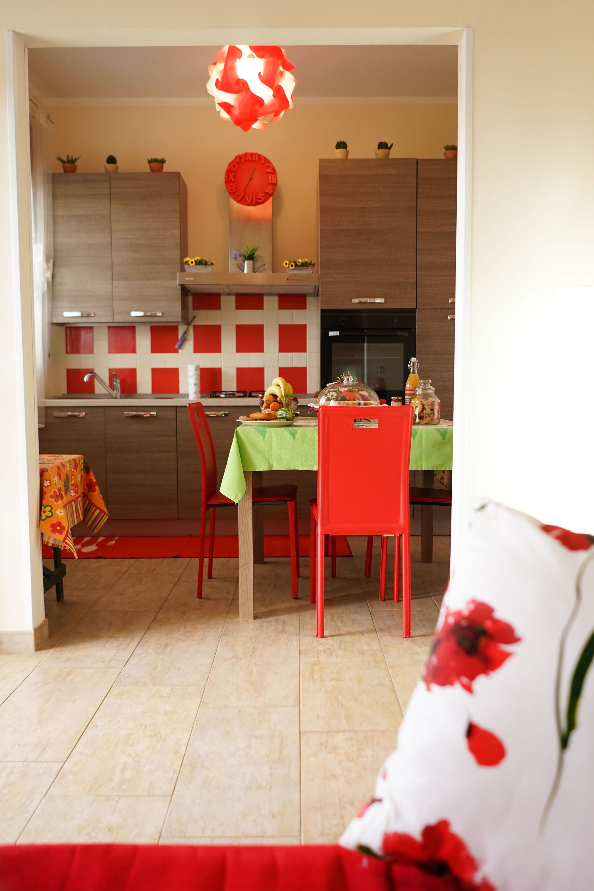 Keuken – woonkamer: goed uitgeruste keuken, eettafel, vaatwasser, ijskast, magnetron, kookplaat, oven, broodrooster, italiaans koffiezetapparaat, bank, WIFI internet, airconditioning, tv, co2 detector, uitgang naar het balkon.
