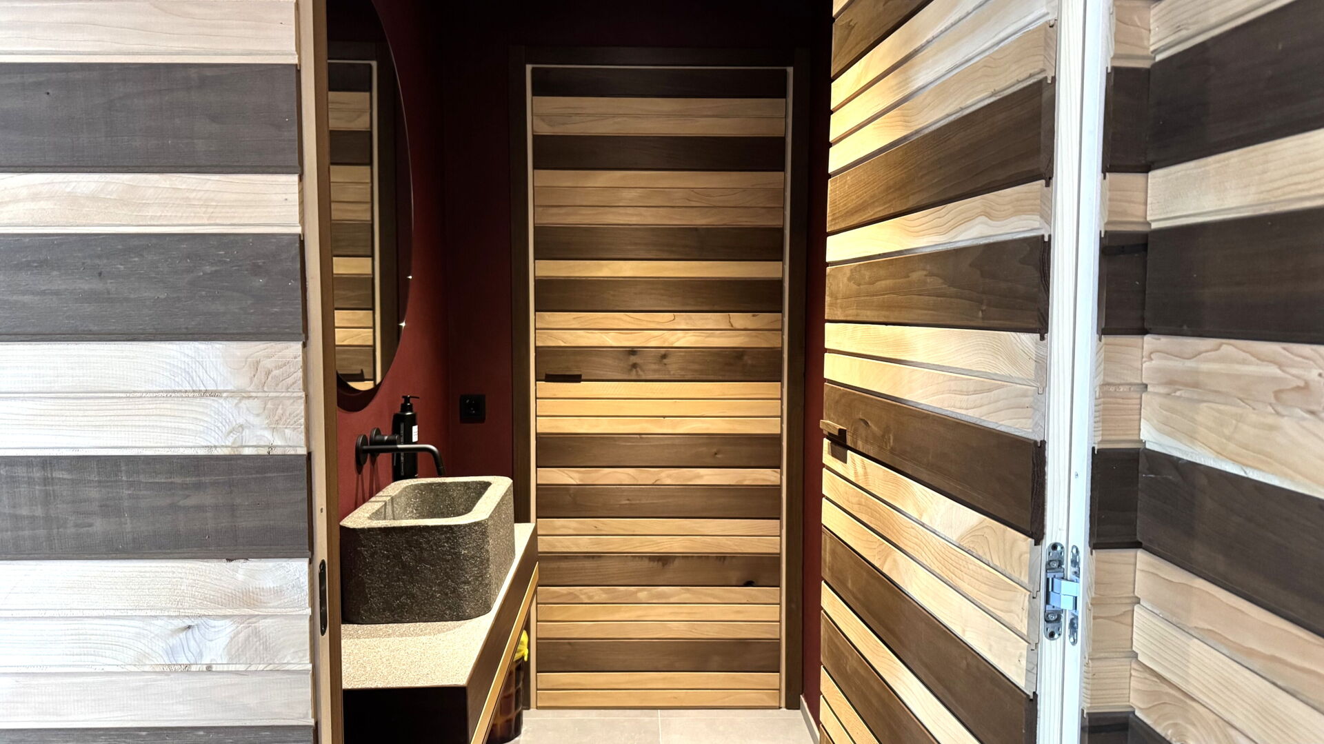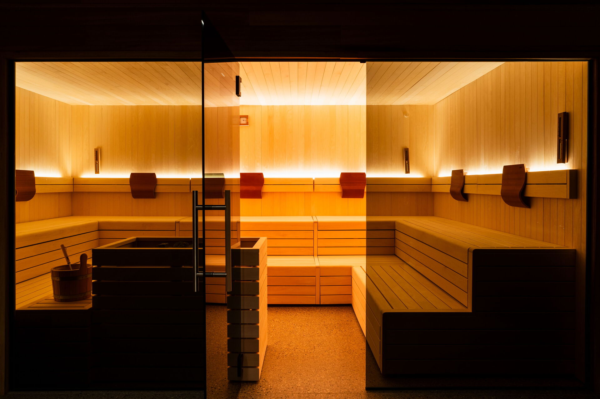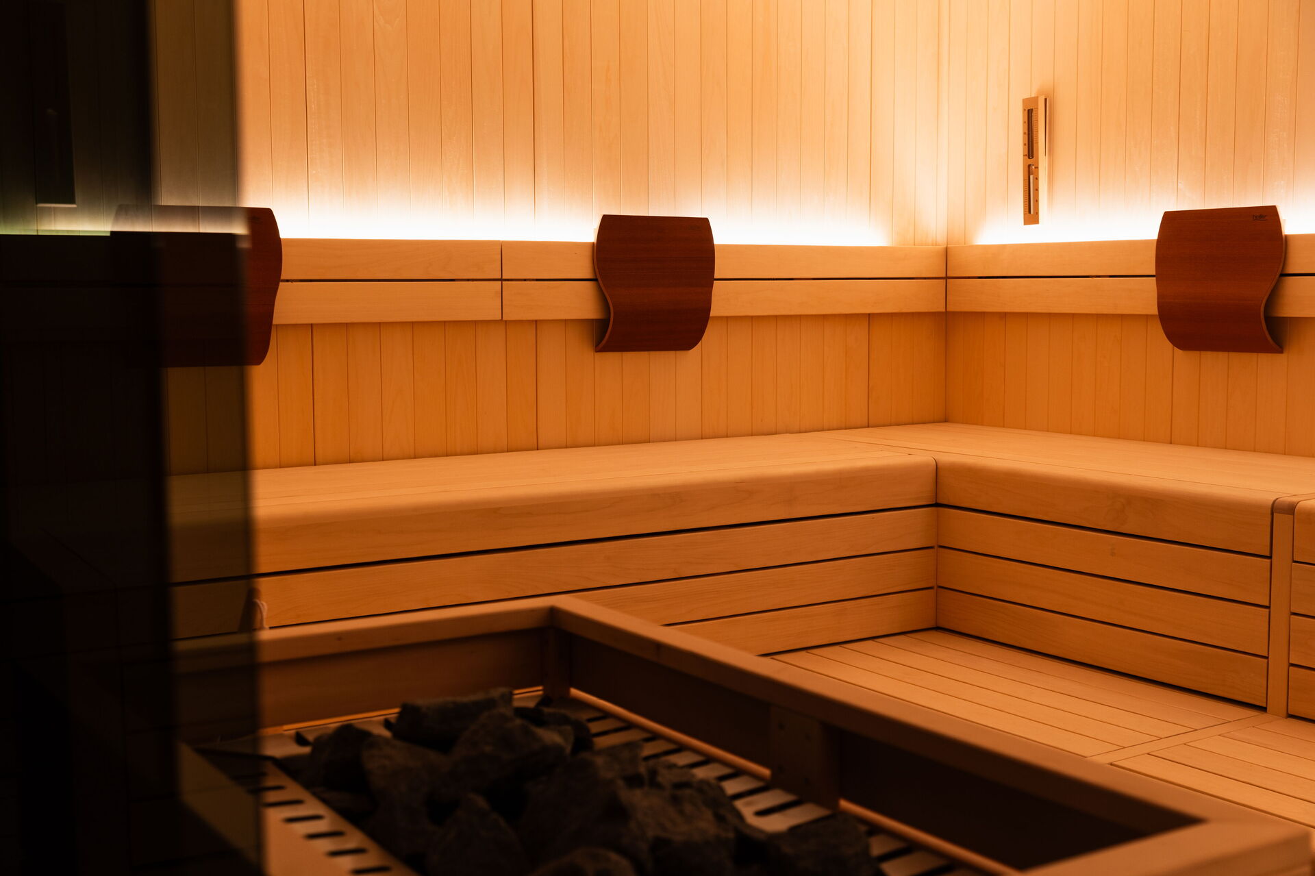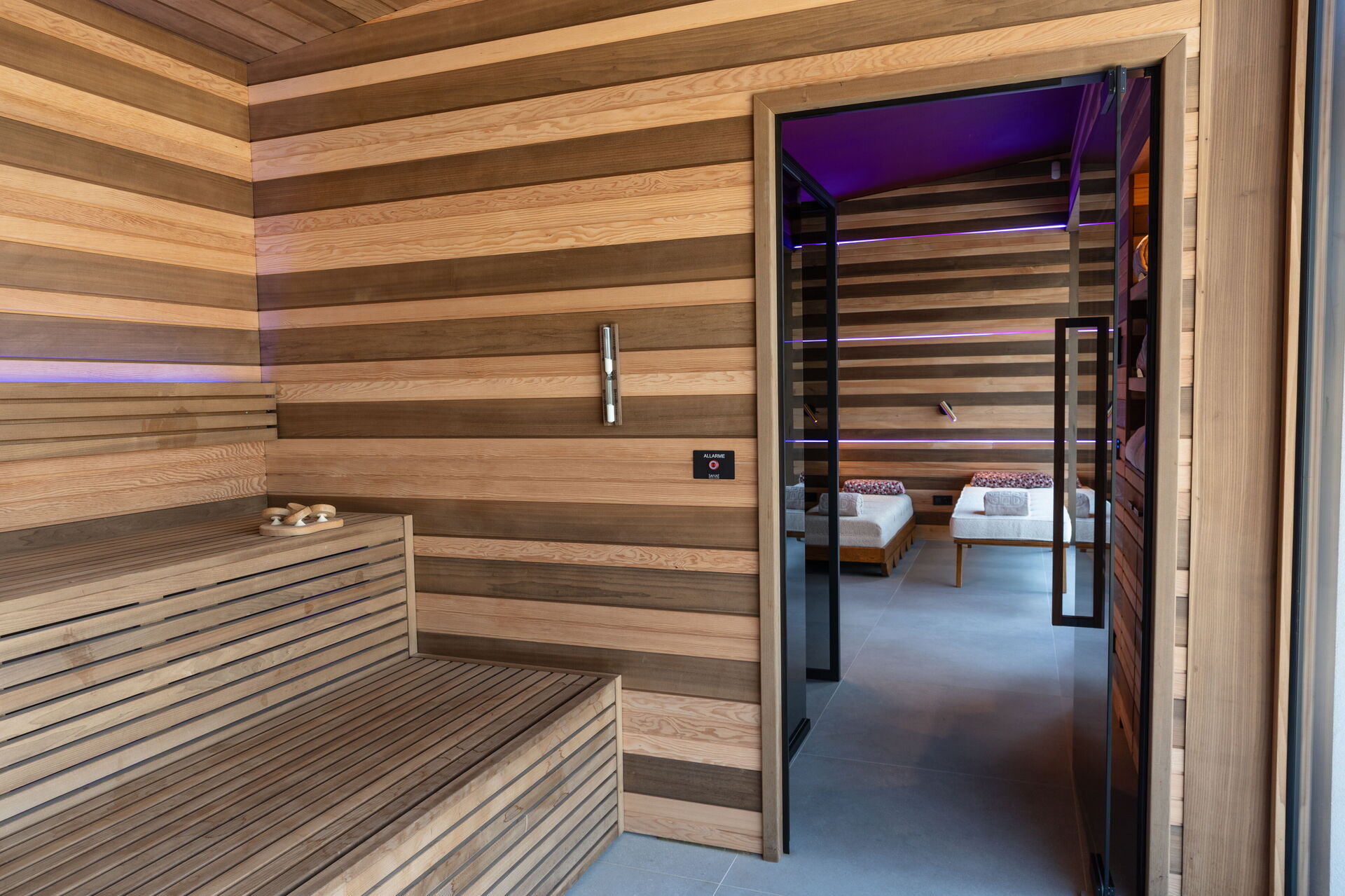 Wellness ruimte 2: douche, sauna, vier ligstoelen.