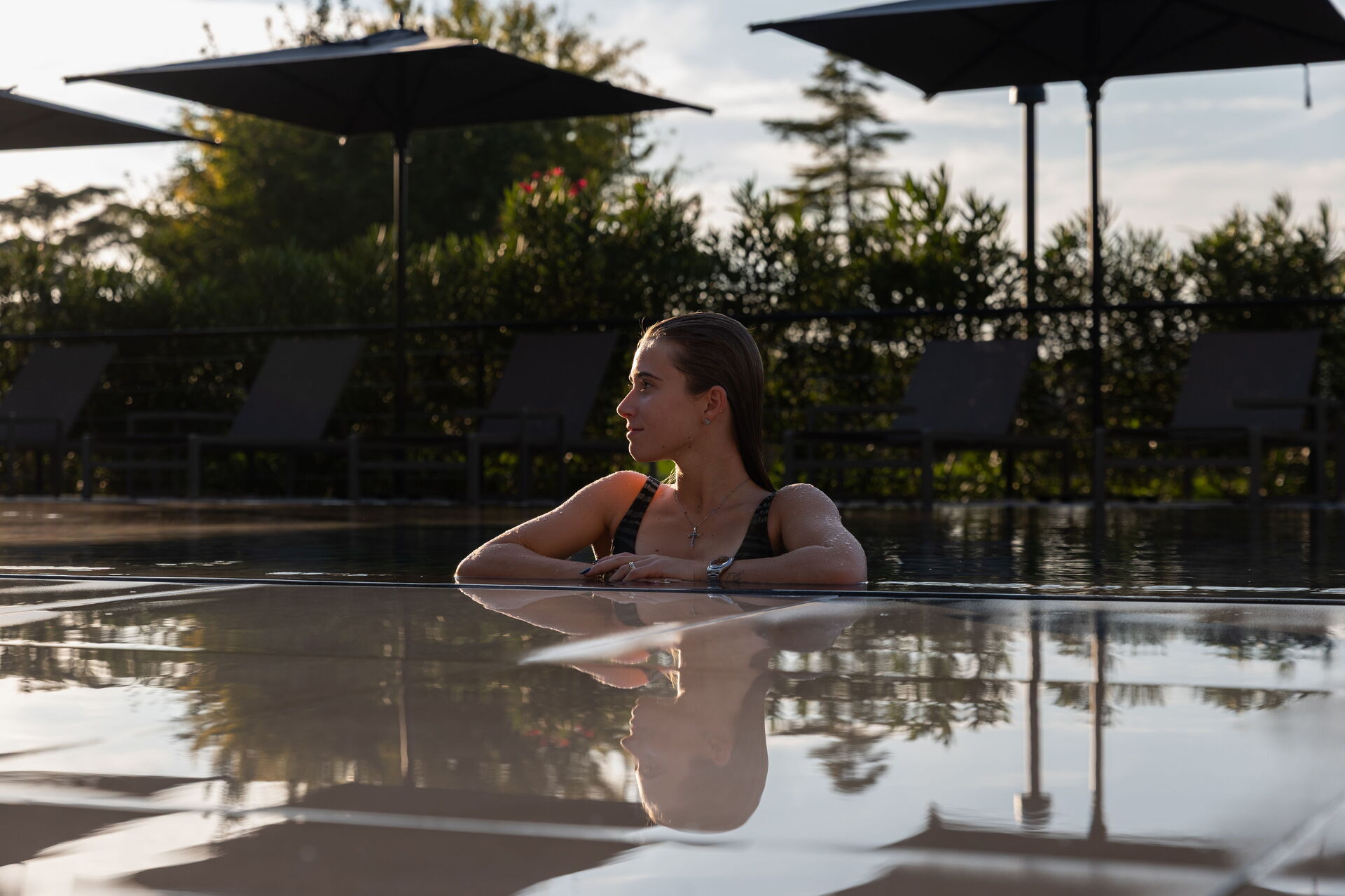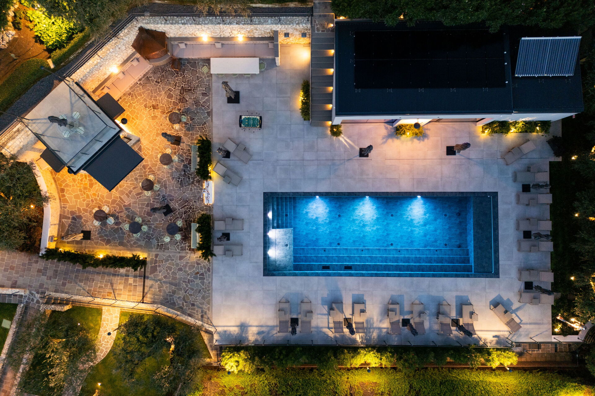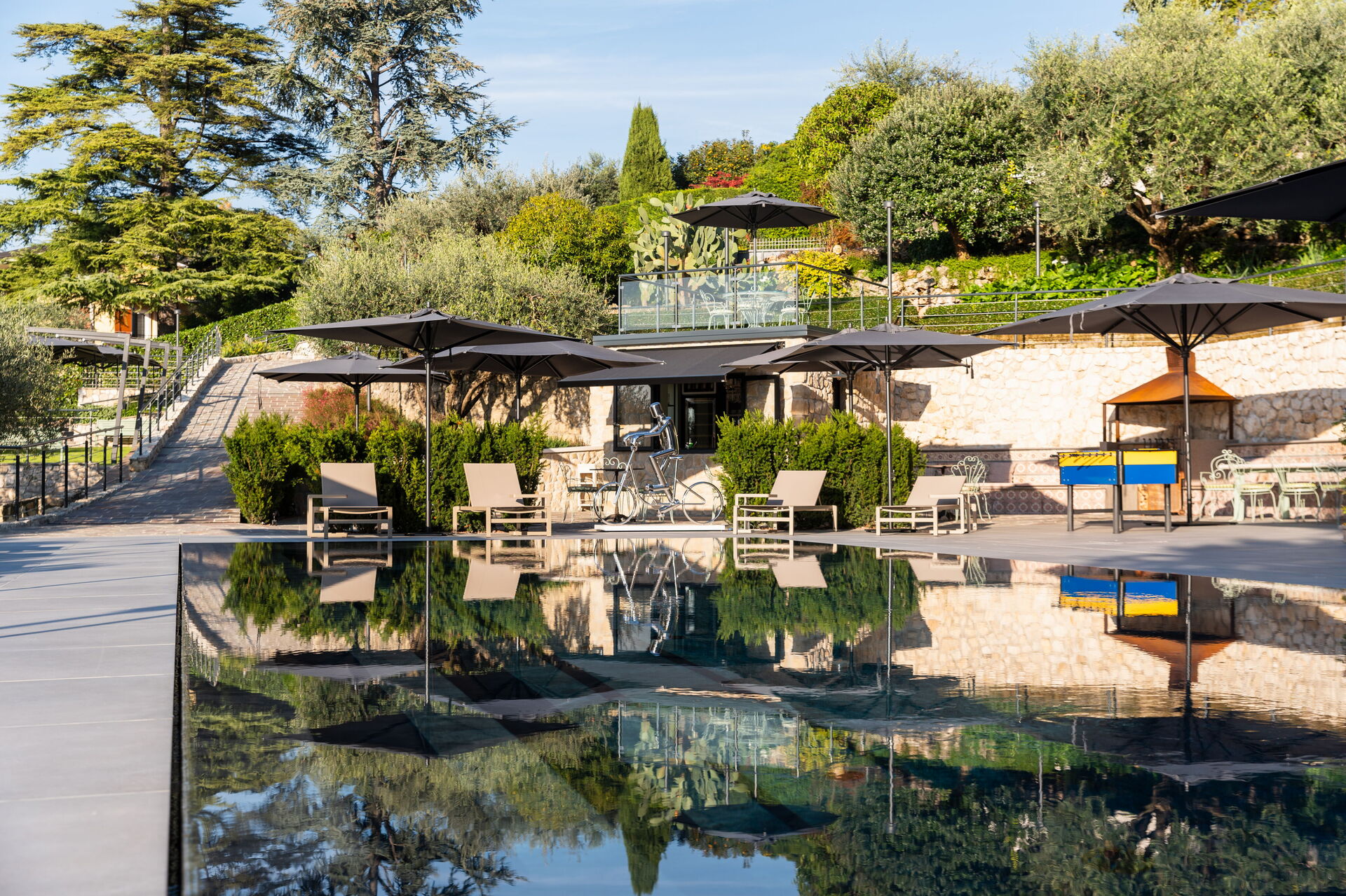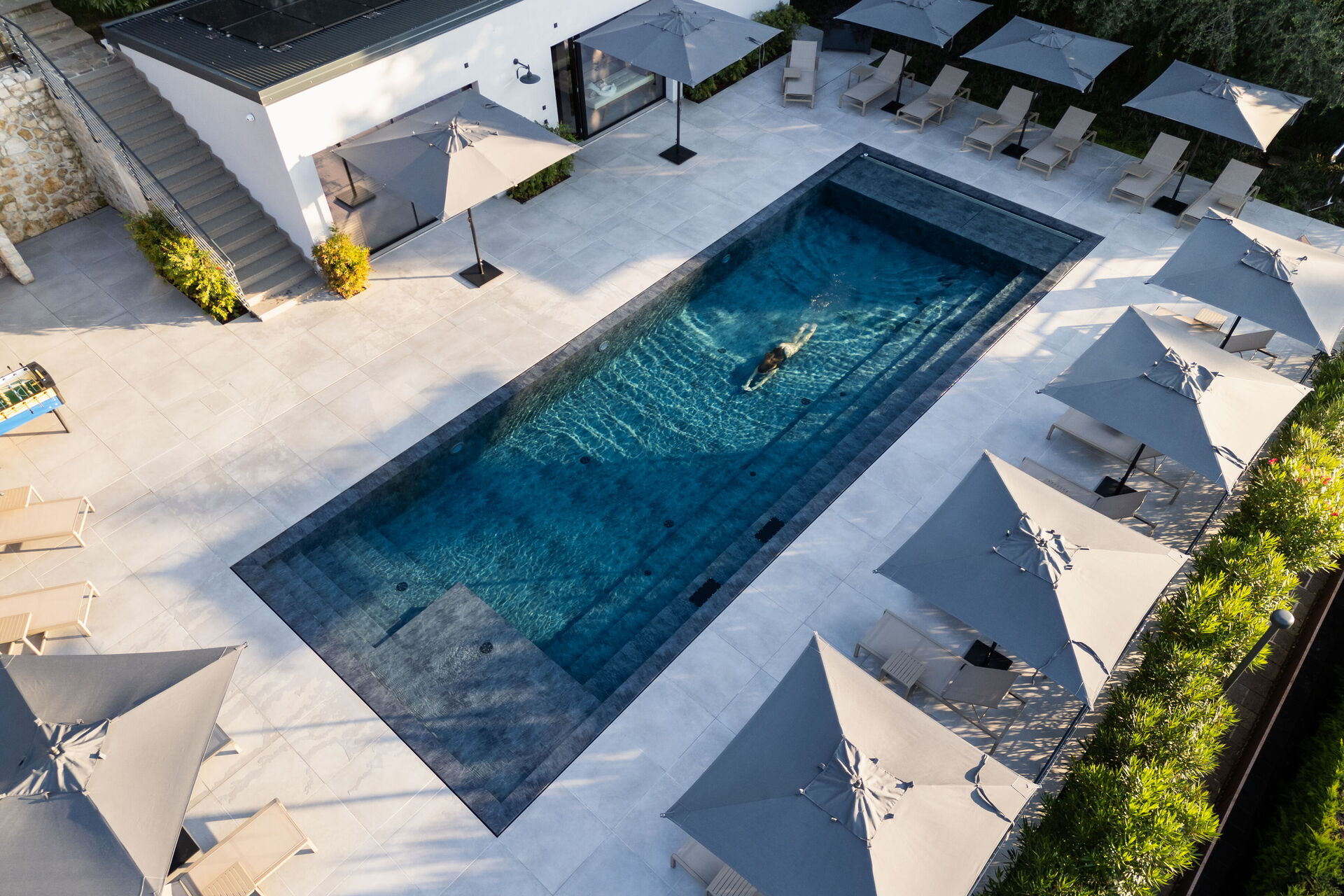 Tuin 1: zwembad (breedte: 5m, lengte: 13m, verwarmd), jacuzzi buiten, twee douches, barbecue, dineren in de buitenlucht, eettafel (personen: 4), 20 ligstoelen.