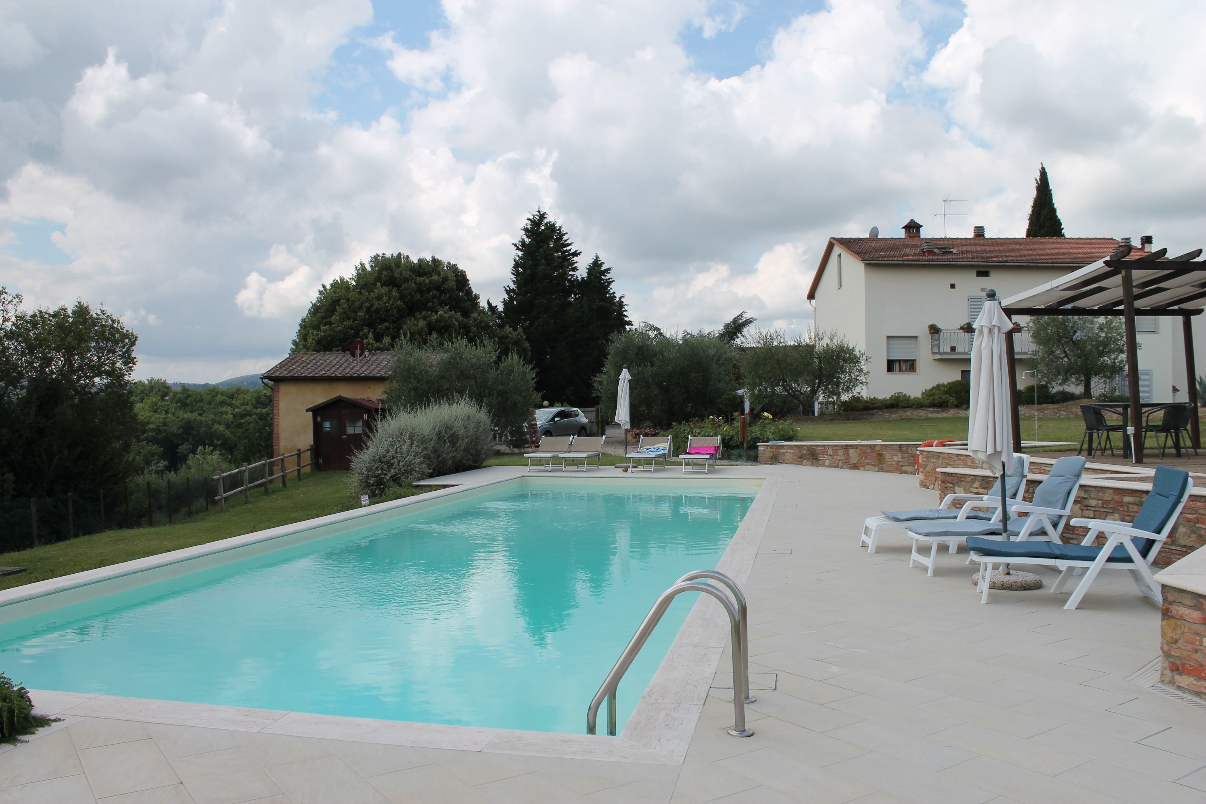 Mooi landgoed op 8 km van San Gimignano met 3 comfortabele woningen: een klein vrijstaand bijgebouw en twee appartementen op de eerste verdieping van het huis waar de eigenaren wonen (zij zijn erg vriendelijk en behulpzaam en maken overigens geen gebruik van de tuin en het zwembad). De locatie is rustig en zeer schilderachtig. Het huis is omringd door wijn- en olijfboomgaarden.