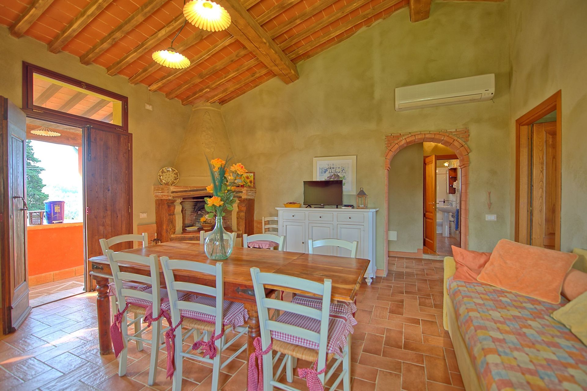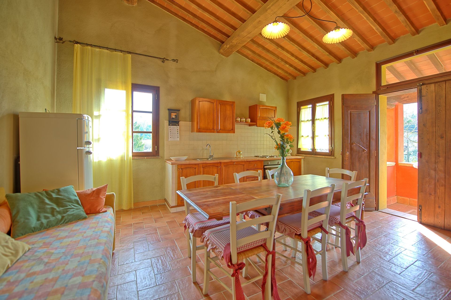 1° verdieping: ruime woon/eetkamer (sat-TV) met open haard en kookhoek (diepvriezer, oven, vaatwasser), 3 slaapkamers met tweepersoonsbed met eenpersoons-slaapfauteuil in elke kamer (kluisje), badkamer met douche (haardroger), WC (zonder raam). Eigen zitplaats buiten.