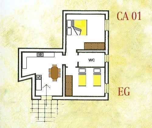 • Woonkamer + slaapkamer met mogelijkheid tot derde bed + 1 slaapkamer met twee eenpersoonbedden