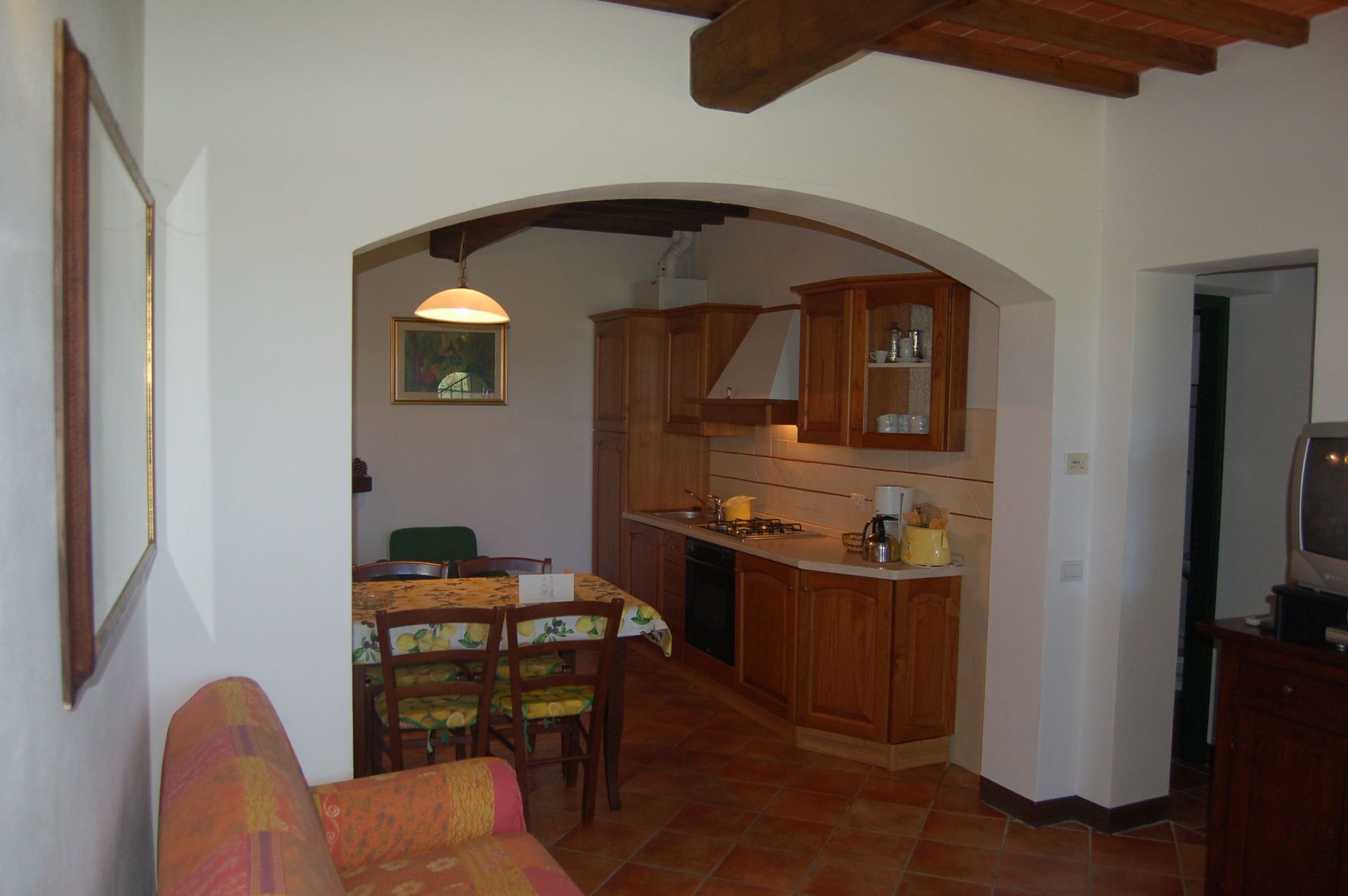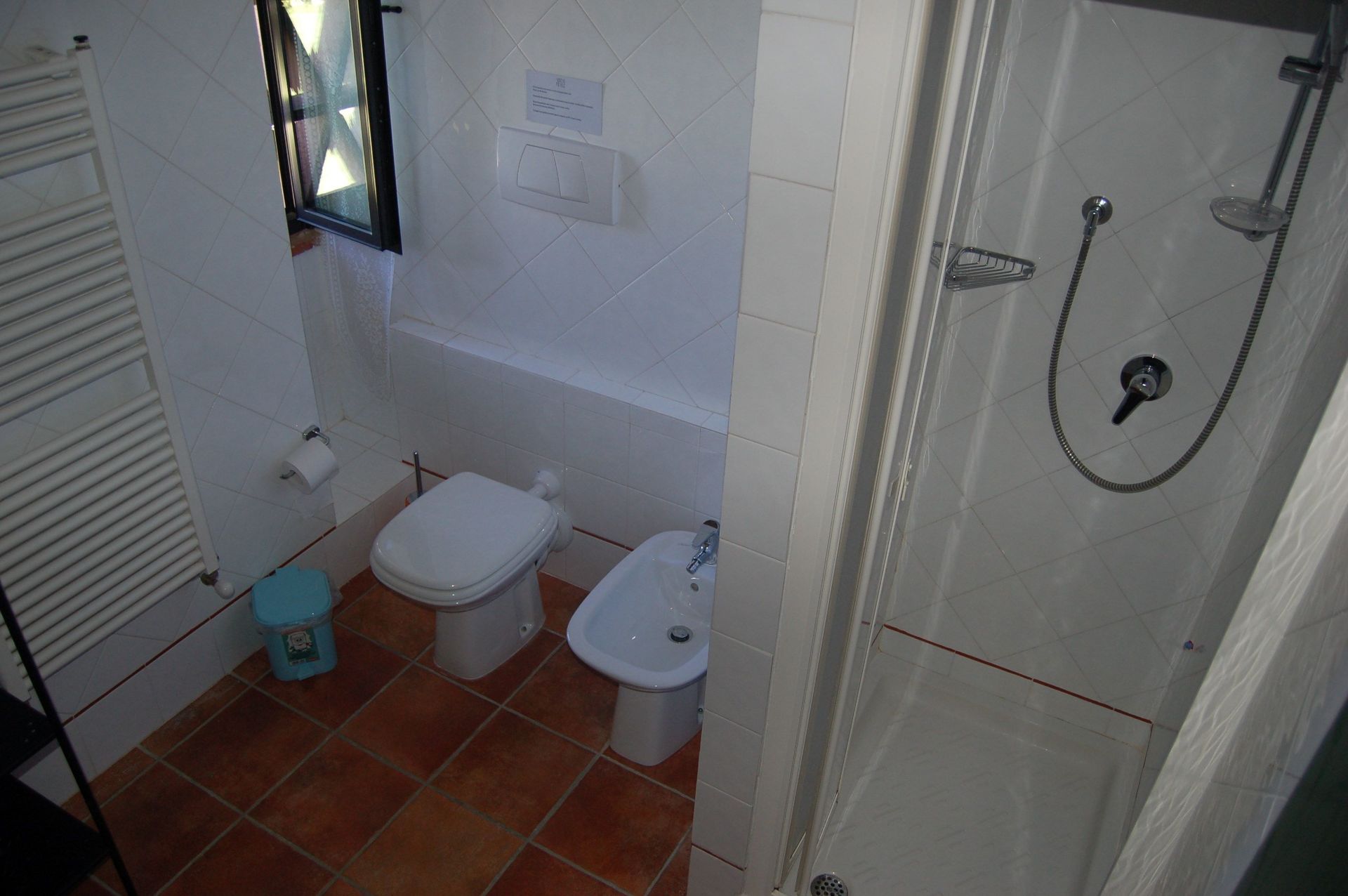 A corridor leads to the second bathroom with shower and to the second double bedroom, full of light. Also this rooms is sheltered by the terracotta bricks and enjoys a fascinating view of the valley with its secular olive trees.