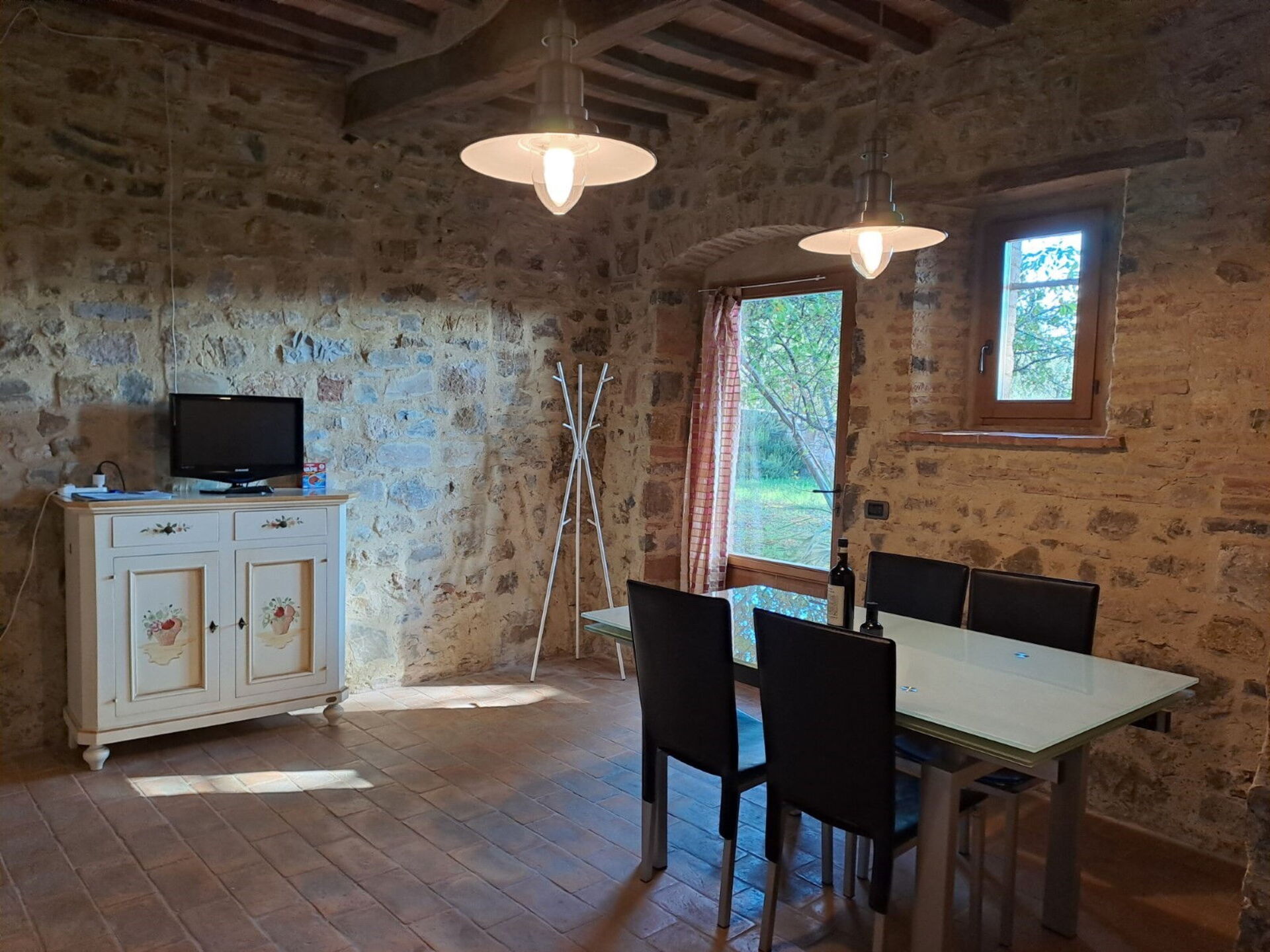 Begane grond: entree, wc met wasmachine, woonkamer met eethoek, tweepersoons slaapbank en toegang tot eigen gemeubileerde buitenruimte, bijkeuken, stenen keuken met open haard (vaatwasser, oven, mokka-koffiezetapparaat, waterkoker, kookplaat, koelkast, vriezer, broodrooster).