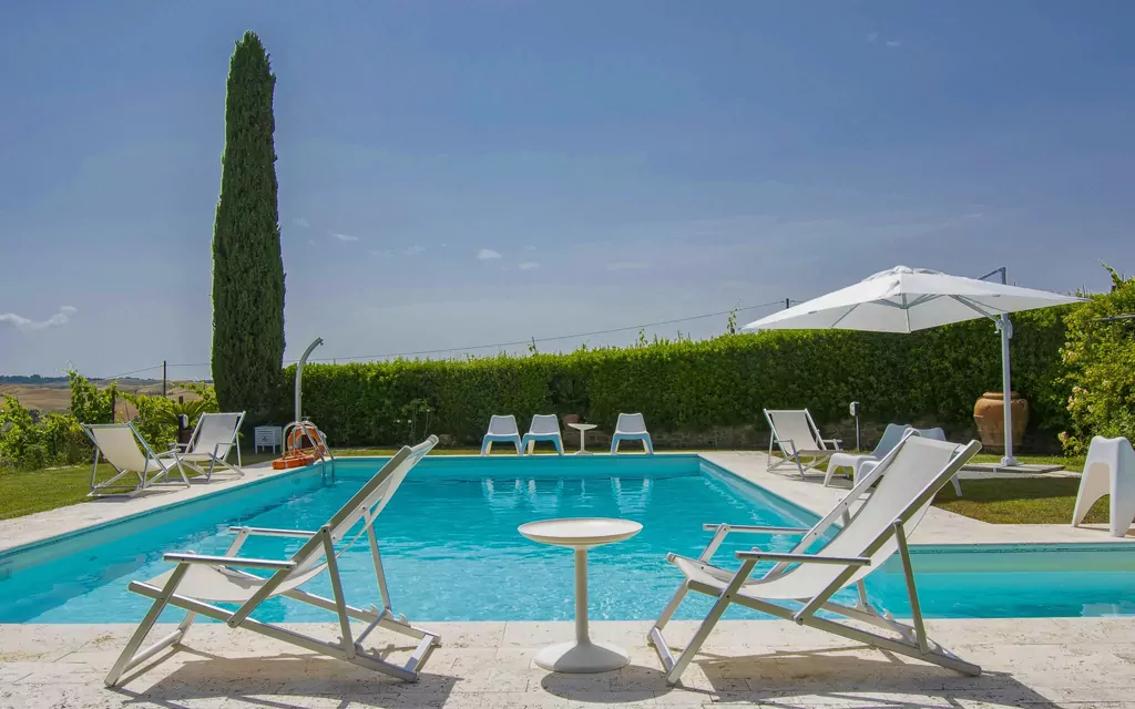 De omheinde tuin strekt zich uit over het landgoed en biedt gasten veel ruimte om te ontspannen en van het Toscaanse landschap te genieten in volledige privacy. Het grote zwembad meet 12 x 6 meter met een diepte van 145 tot 300 centimeter en is beschikbaar van mei tot oktober; een buitendouche bevindt zich in de buurt. De patio en terrasgebieden zijn voorzien van tuinmeubilair en bieden comfortabele ruimtes voor buitendinen, zonnebaden of het genieten van het uitzicht. Een barbecueplaats is beschikbaar voor gasten die buiten willen eten. Een tennisbaan is ter beschikking van gasten; het goed onderhouden gazon en beschaduwde terrassen maken de buitenomgeving ideaal voor ontspanning en buitenleven.
