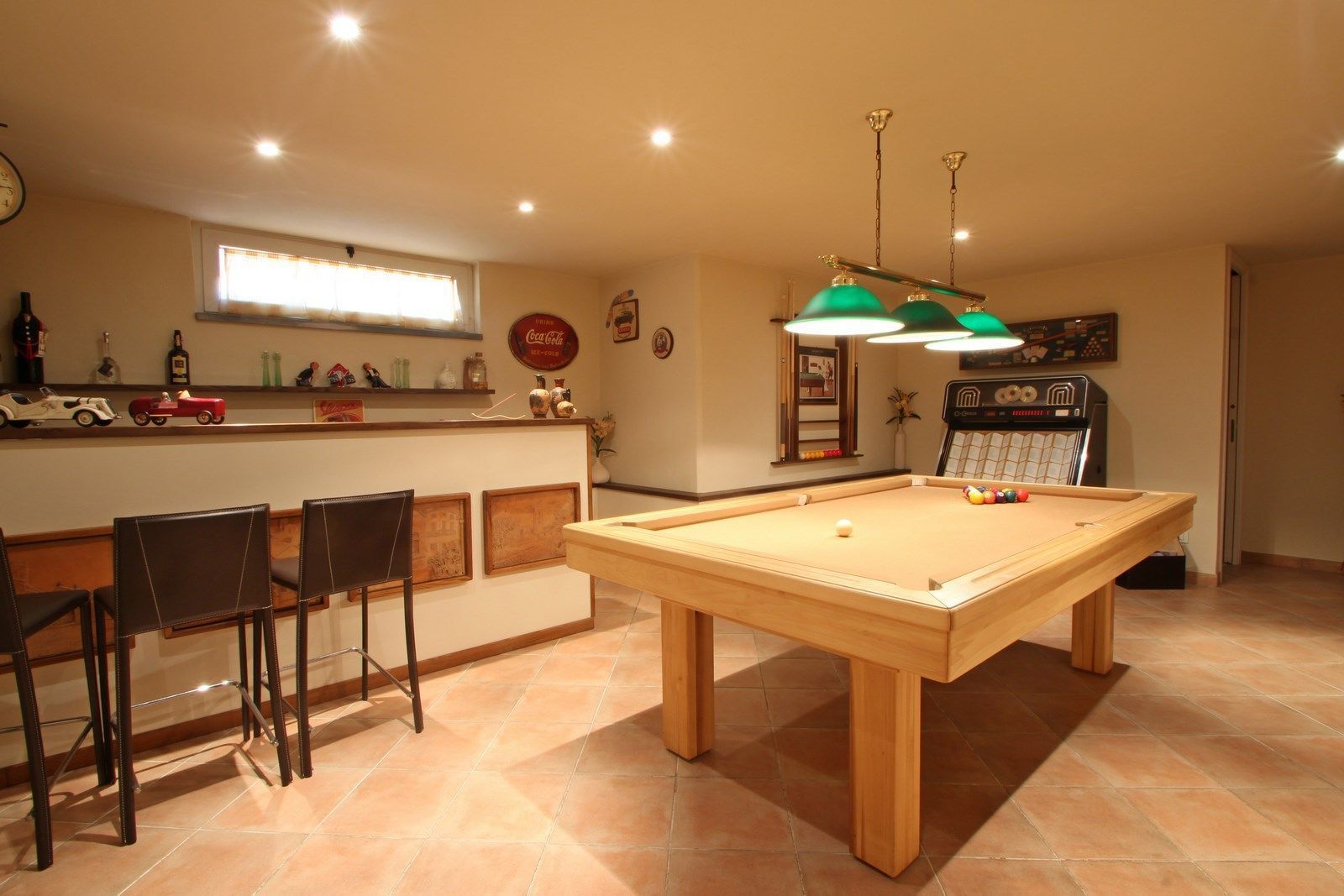 Amusement area with bar (has fridge), pool table and jukebox.