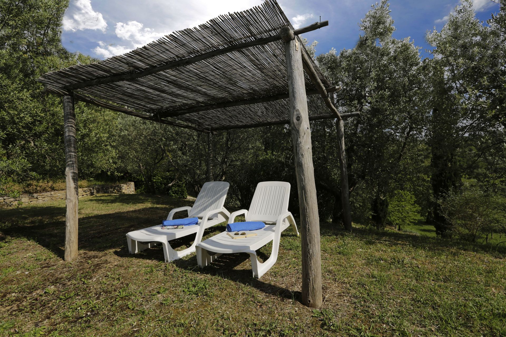 In de tuin ligt een eigen buitenzitje voor de gasten van dit appartement.